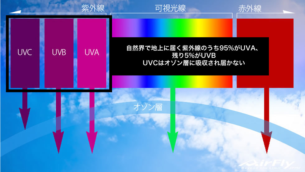 UVCは、太陽光の波長の中で最も危険な波長(254nm)で、地球を覆うオゾン層に遮られる為、通常地表へは届きません。また、UVCは細胞のDNAを破壊する力が強いので、細菌やウィルスを死滅させる、強い殺菌力を持っています。